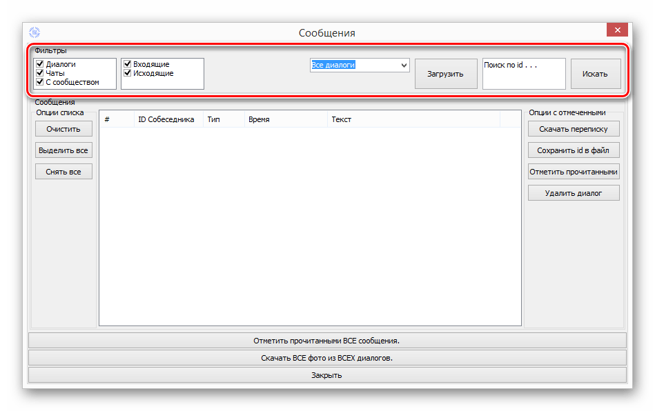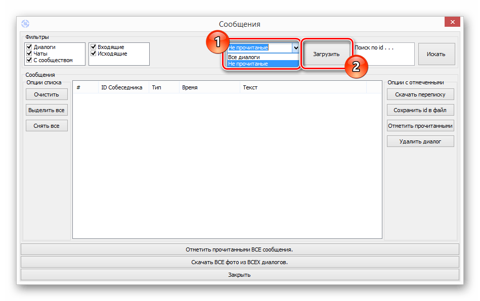 - В появившемся окне необходимо уточнить фильтры (откуда и какой тип ЛС загружать). В нашем случае это пункты «Диалоги», «Чаты», «С сообществом», «Входящие».