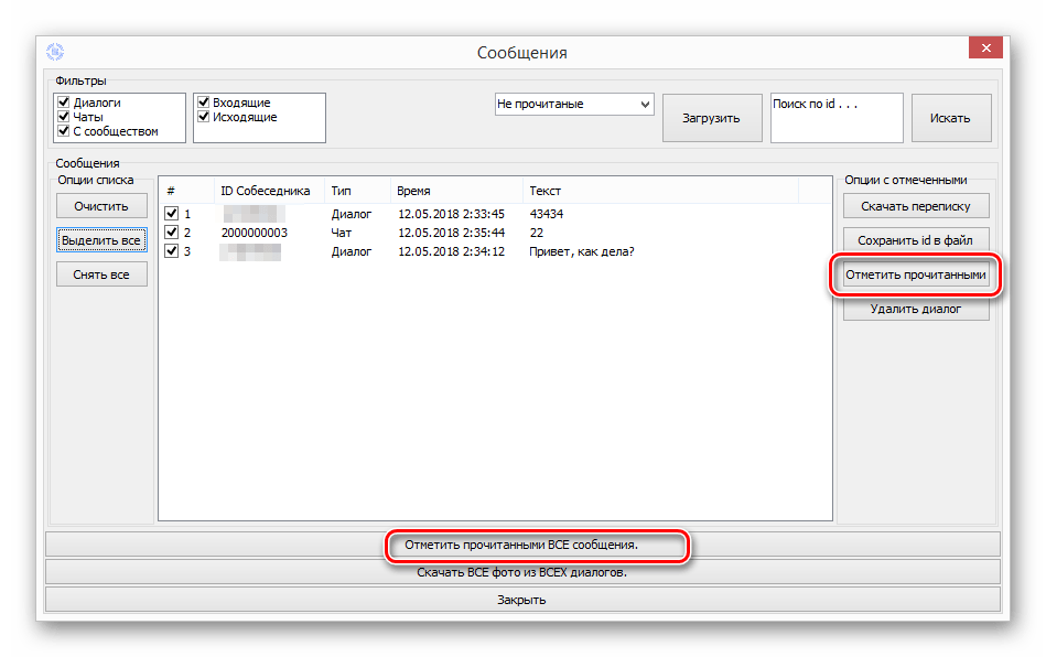 - После того как программа загрузит все непрочитанные ЛС, вы сможете отметить их прочитанными, нажав соответствующую кнопку внизу интерфейса (или отметить все и нажать кнопку справа).