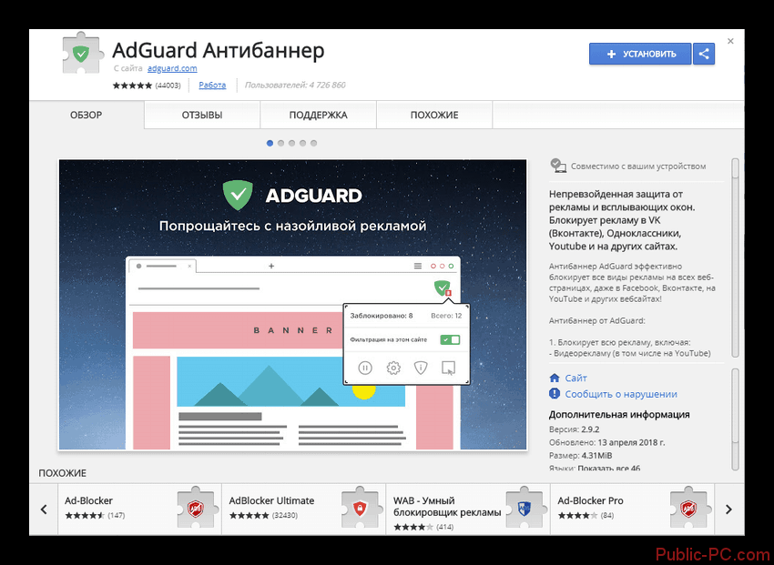 Это расширение является представлением от одноимённой программы, которая отключает рекламу на компьютере, выполняет функцию оптимизатора и антивируса. Для того, чтобы использовать Adguard в качестве расширения для блокировки рекламы не обязательно что-то скачивать и устанавливать к себе на компьютер, так как достаточно будет только установить в браузер специальное расширение, которое называется Adguard Антибаннер.