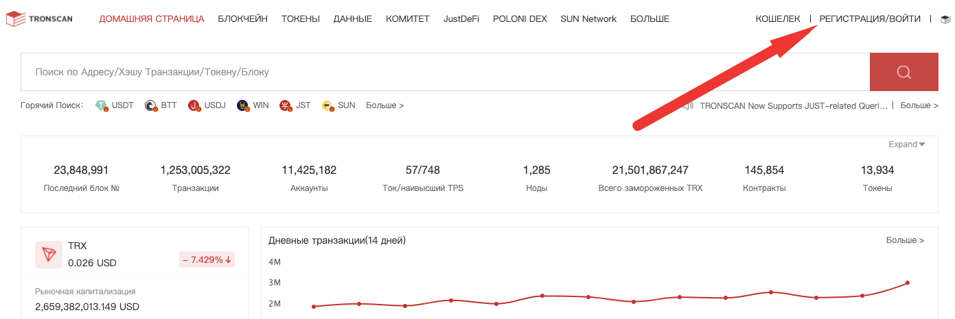 Если вы пользуетесь браузерным расширением TronLink, то для заморозки монет вам требуется пройти регистрацию на сайте Tronscan. Перейдя на ресурс, воспользуйтесь кнопкой «Регистрация/Войти». На открывшейся странице будет представлена форма регистрации, в которой потребуется выбрать ссылку «Зарегистрироваться».