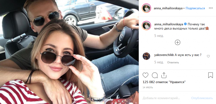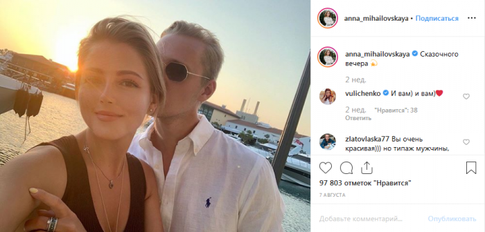 Красавица, сумевшая влюбить в себя миллионную аудиторию, не страдала и от отсутствия мужского внимания. Сейчас она счастливо замужем за актёром Тимофеем Каратаевым, также известным по звёздным ролям в телесериалах. И в Инстаграм Анна Михайловская щедро делится как работой, так и семейным счастьем.