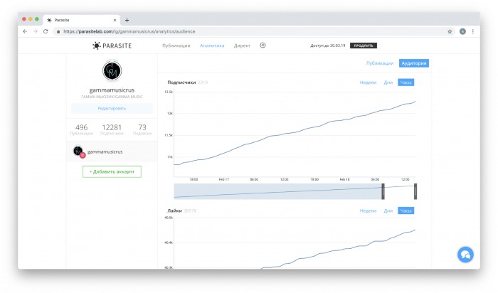 Для отслеживания этого параметра лучше использовать сторонние инструменты. Например, сервис Паразайт позволяет видеть динамику прироста и отписок с помощью графика по часам, дням и неделям. Также темпы роста здесь можно отслеживать по лайкам и комментариям.