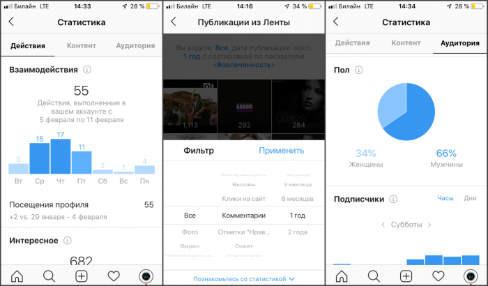 - Возможность глубоко проанализировать аккаунт, в частности – географию подписчиков, вероятную досягаемость, распределение аудитории по полу;