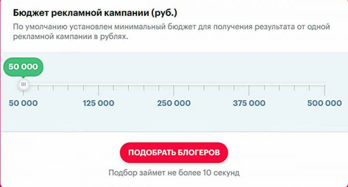 Также сервис предлагает автоматически подобрать блогеров на основе целевой аудитории заказчика и запланированного бюджета на рекламу. Минимальный бюджет рекламной кампании в этом случае – 50 000 рублей.
