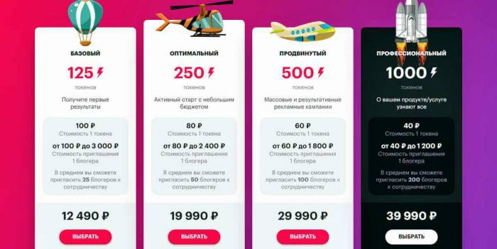 Покупка токенов – это плата рекламодателя за доступ к платформе. Если думаете, что сюда включена стоимость рекламной кампании – ошибаетесь. С блогерами договаривайтесь сами.