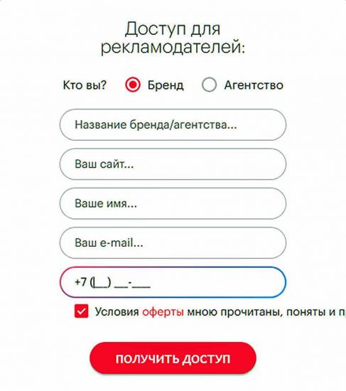Регистрация рекламодателя здесь тоже не самая простая. Для начала надо выбрать в качестве кого заказчик пришел на платформу – бренда или агентства. Затем заполнить обязательные поля: номер телефона, емэйл, название агентства или бренда. Логин и пароль для входа на биржу найдете в электронном письме.