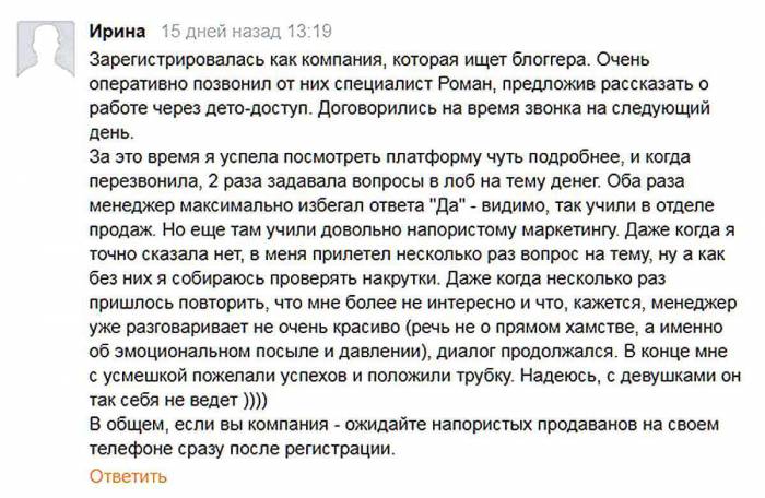 - У блогеров, которые уже выполняли заказы, можно увидеть отзывы других рекламодателей.
