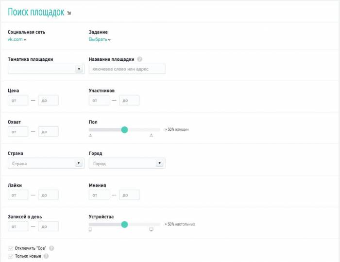 Отсортировать список площадок после фильтрации можно по количеству участников, охвату, цене и новизне площадки.