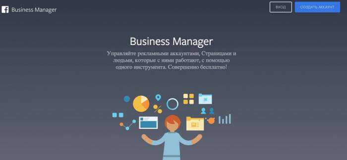 Чтобы настроить бизнес-менеджер от Facebook, вам нужно зайти на эту страницу. Выглядит она следующим образом: