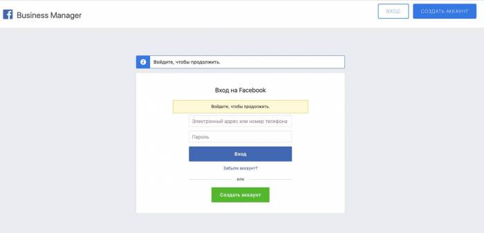 Для регистрации в Business Manager система сначала запросит данные, чтобы зайти в основной профиль.