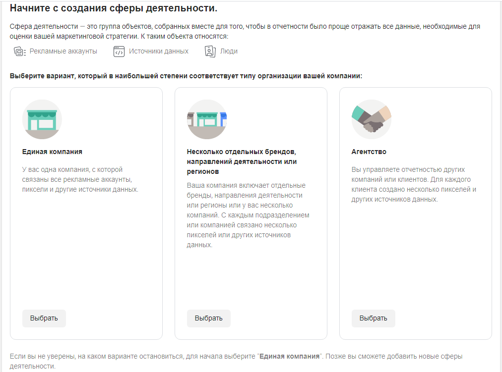 Если вы впервые используете Facebook Атрибуцию, сгруппируйте рекламные аккаунты и источники данных (пиксели, приложения и группы офлайн-событий) в четкие сферы деятельности.
