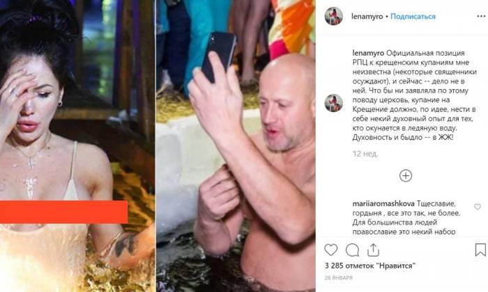 Например, Лена Миро обсуждала тех, кто на Крещение купается в проруби ради эффектного селфи: «То, как ведут себя некоторые товарищи на Крещение, меня откровенно отвращает. Окунуться в прорубь для них — это не более, чем повод запилить фоточку в Инстаграм».