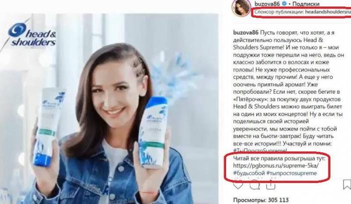Основное направление рекламы Бузовой – товары для красоты и здоровья. Ее ровные белоснежные зубы подарили красавице контракт с фирмой, производящей ирригаторы для рта «Waterpic». Пост с коротким роликом стоил компании около 400 тысяч рублей.