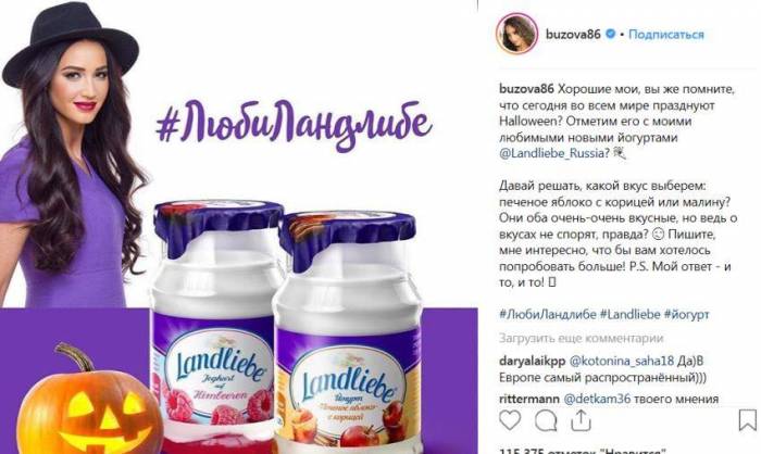 Компании, специализирующиеся на выпуске продуктов питания также не обходят звезду своим вниманием. За пост, рекламирующий сливочно-ягодные йогурты в Инстаграме фирма «Landliebe» заплатила не менее 450 тысяч рублей