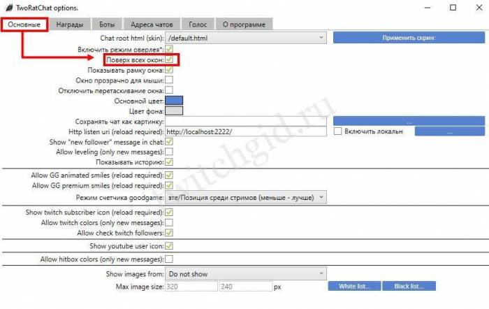 Программный продукт TwoRatChat наиболее удобен для вывода чата в эфир. Чтобы включить софт потребуется зайти в настройки и активизировать функцию «Поверх всех окон». Завершается операция кликом по строке «Сохранить чат как картинку».