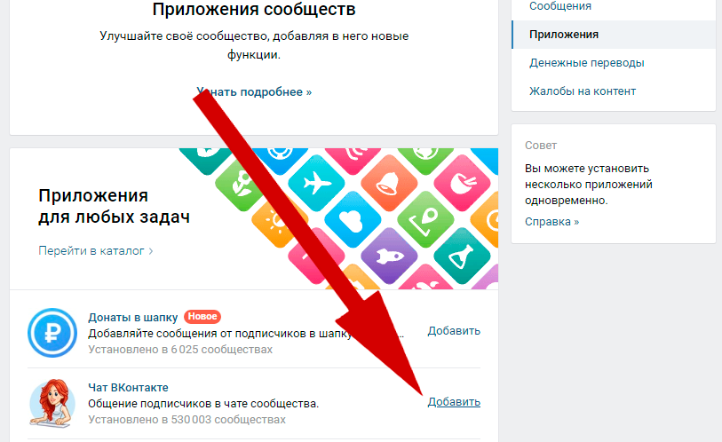 Далее среди перечня настроек выберите «приложения» справа. Данный пункт есть в любом сообществе, его тип не имеет значения.