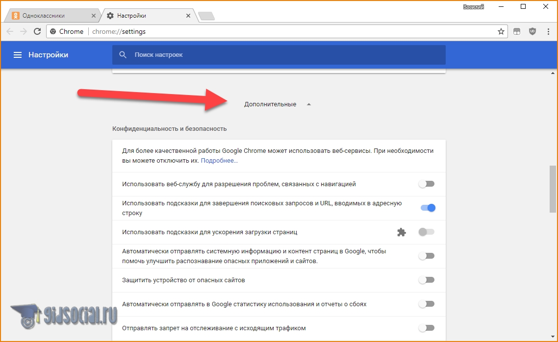 3) Далее нужно найти подраздел «Конфиденциальность и безопасность» и открыть вкладку «Настройки сайта».