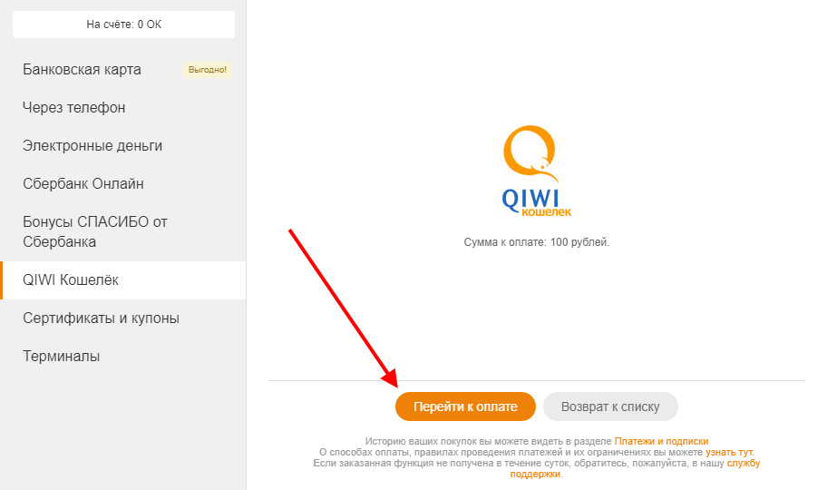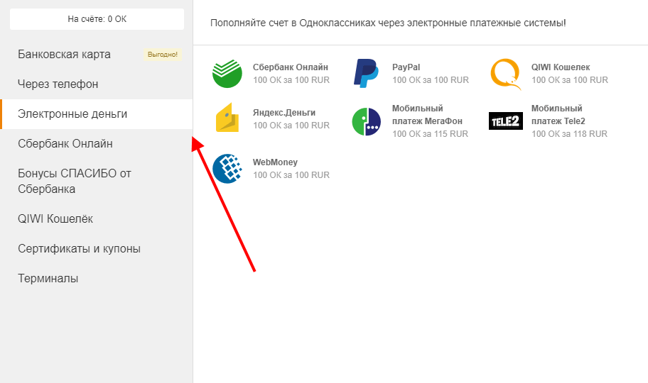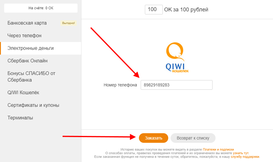 Если пользователь имеет электронный кошелек, то он может без проблем оплатить при помощи него ОК. Это может быть Яндекс деньги, QIWI Кошелек или Webmoney. Как воспользоваться данным методом на примере QIWI Кошелька: