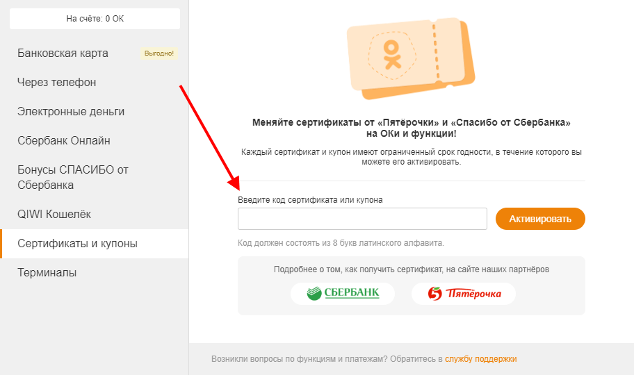 На сайте представлен специальный раздел «сертификаты и купоны», при помощи который также можно получить определенное количество ОК, если у пользователя имеются требуемые коды.