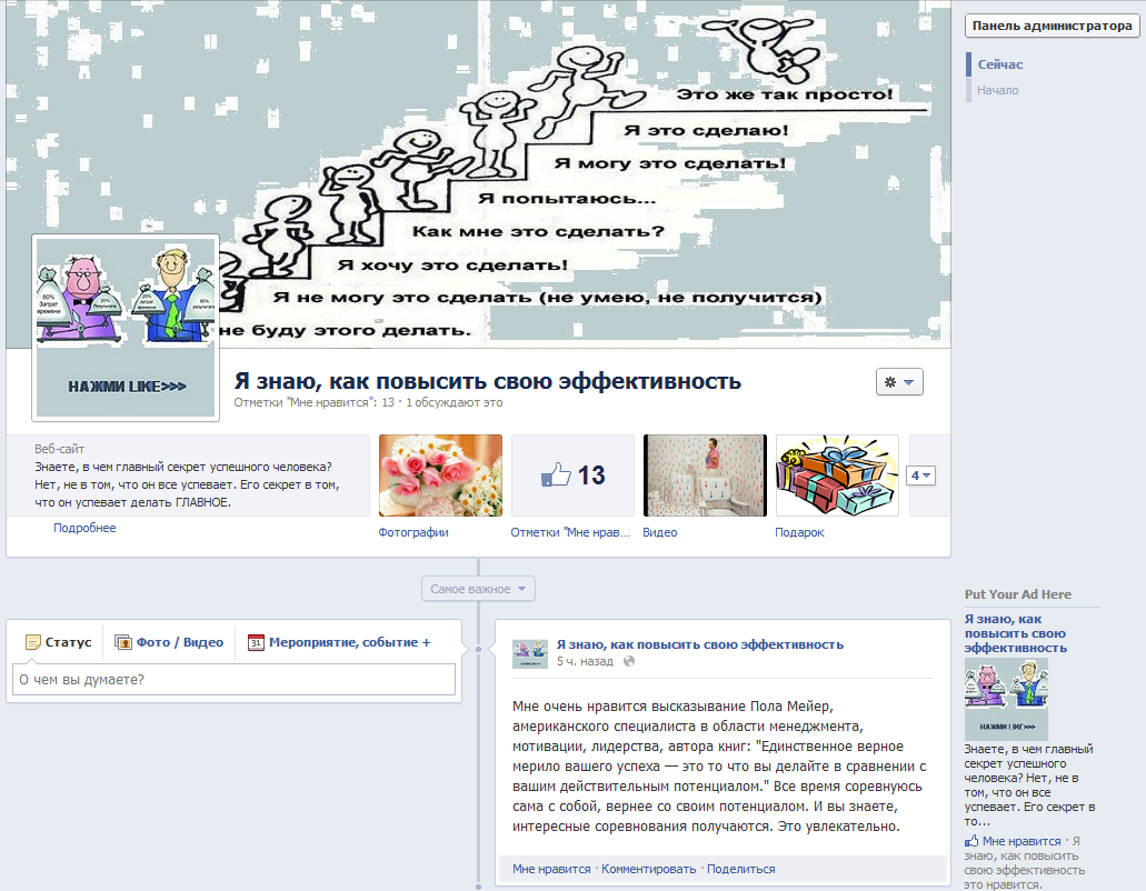 Страница является представителем товара, услуги, организации. Здесь публикации осуществляются лишь от имени самой страницы. Они попадают в новостные ленты фанов, что обеспечивает максимальный охват заинтересованной аудитории. Это главный фактор эффективности фанпейдж в соцсети. Публикации фанов на стене страницы не попадают в новостную ленту, увидеть их могут лишь посетители при просмотре страницы.