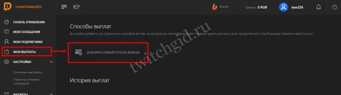 - Теперь вернитесь к панели слева и выберите строку «Мои выплаты» – мало установить донат на Твиче, нужно научиться выводить деньги;
