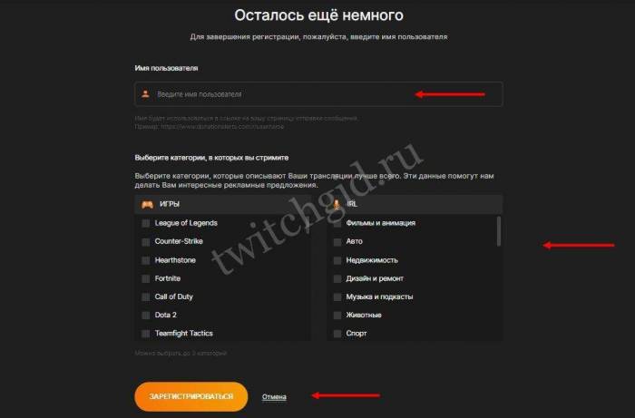 Введите имя пользователя, укажите категории, в которых чаще всего стримите и нажмите на значок «Зарегистрироваться»;