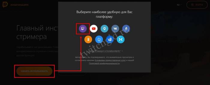 - Выберите нужную платформу (Твич) из открывшегося списка;