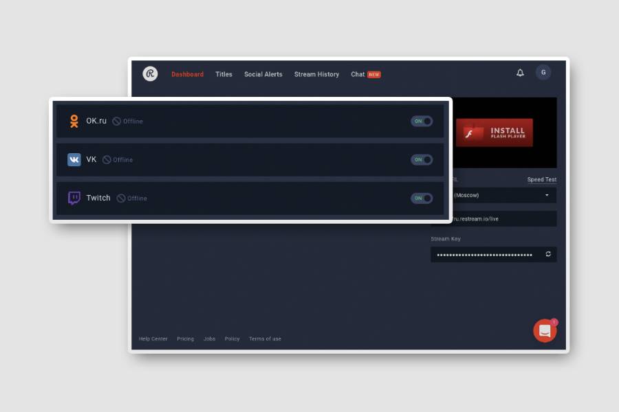 Выберите название и описание для стрима, загрузите обложку для видео, и можно начинать трансляцию! Единственное, рекомендуем заранее установить Adobe Flash Player и разрешить использование Flash.