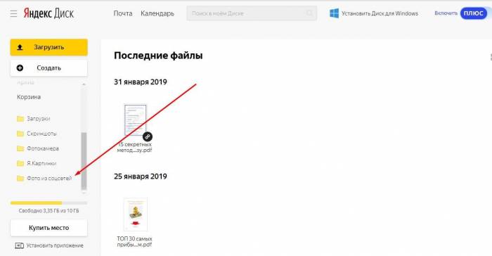 Сразу после того, как вы загрузите свой Яндекс Диск и зайдёте в него, вы попадёте на главную страницу, где в дальнейшем будут отображаться ваши файлы с документами. Слева ниже вы увидите папку «Фото из соцсетей» и нажимаете на неё: