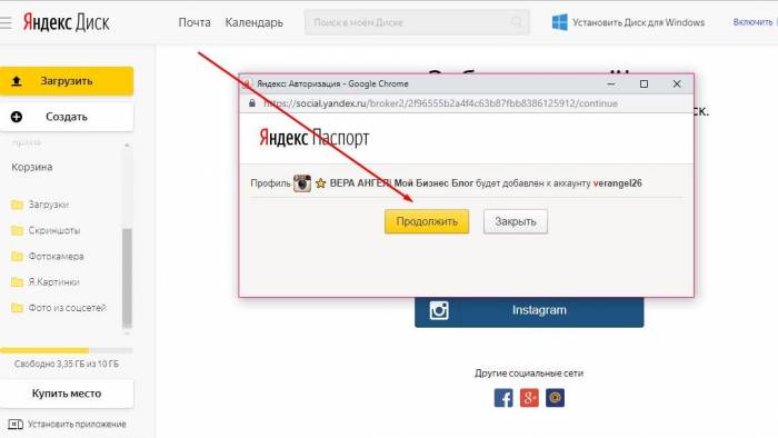 После этого, у вас появится окошко с названием вашего аккаунта в Инстаграм, где вы должны нажать жёлтую кнопку «Продолжить»