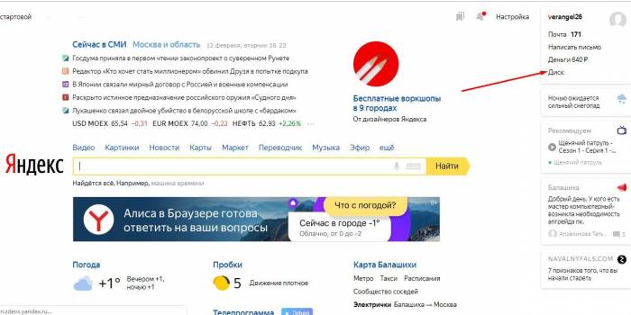 После того, как у вас появится ваш почтовый ящик Яндекс, вы заходите в него под своим логином и паролем, и справа вверху нажимаете «Диск»: