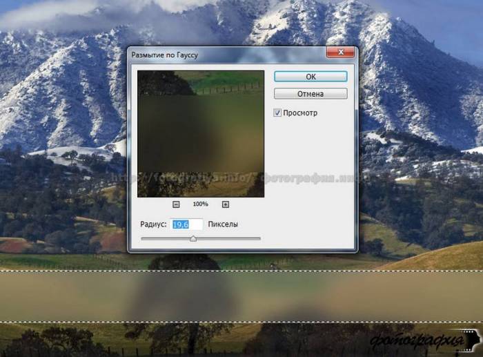 Совершите щелчок левой кнопкой мыши по слою-копии. Теперь зажмите клавишу Ctrl и щелкните левой кнопкой мыши по миниатюре слоя «Матовый фон» (не по её названию). У вас будет выделена часть слоя с пейзажем, расположенная под созданным ранее прямоугольником. Далее перейдите по пути «Фильтр>Размытие>Размытие по Гауссу». Радиус увеличьте до 20 пикселей. Если разрешение фотографии очень маленькое, то радиус может быть и меньше.