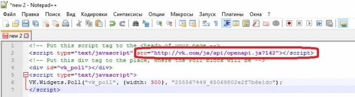 Перед нами откроется окошко, в котором будет приведён скрипт, содержащий в себе код голосования. Копируем содержимое окна. Теперь скопированный текст вставляем в текстовый редактор (можно в стандартный Блокнот Windows).