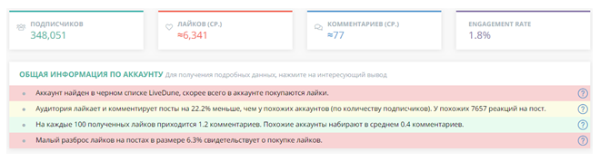 Чтобы не просто вложить кровные в Гивэвей в Инстаграме, а выиграть хотя бы в приросте подписчиков, нужно как можно внимательнее проверять качество потенциального аккаунта донора. Для этого обязательно проверьте его на отсутствие накруток, например, через Livedune.