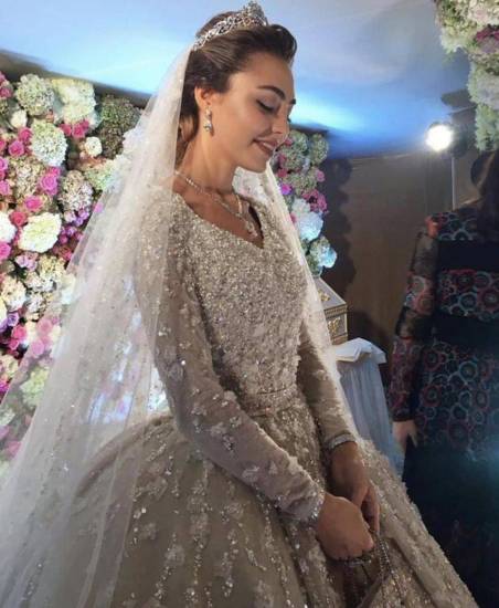 На торжестве девушка блистала в поистине невероятном платье, изготовленном по индивидуальному заказу во Франции руками самого Эли Сааба. Наряд невесты весил почти 25 килограммов за счет огромного количества мелких камней, которыми он был украшен. Как известно, платье обошлось жениху в целых 27 миллионов рублей.