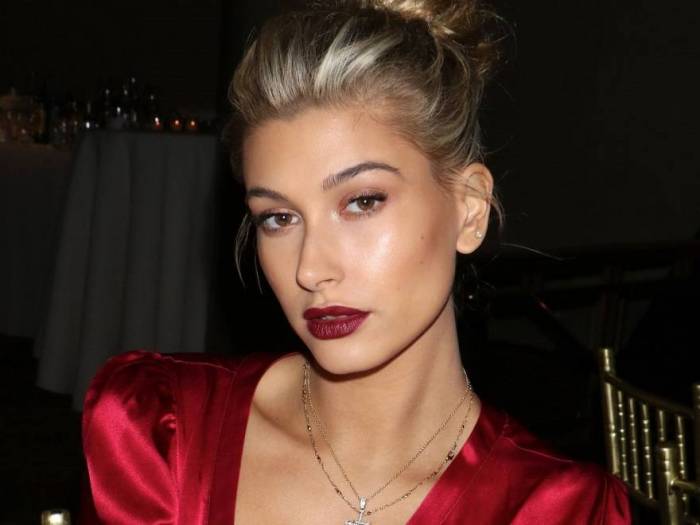 Хейли идет по пути своей подруги из семейства Кардашьян и подчеркивает объем губ филлерами на основе гиалуроновой кислоты: об этом свидетельствует очерченная и слегка вывернутая красная кайма верхней губы.