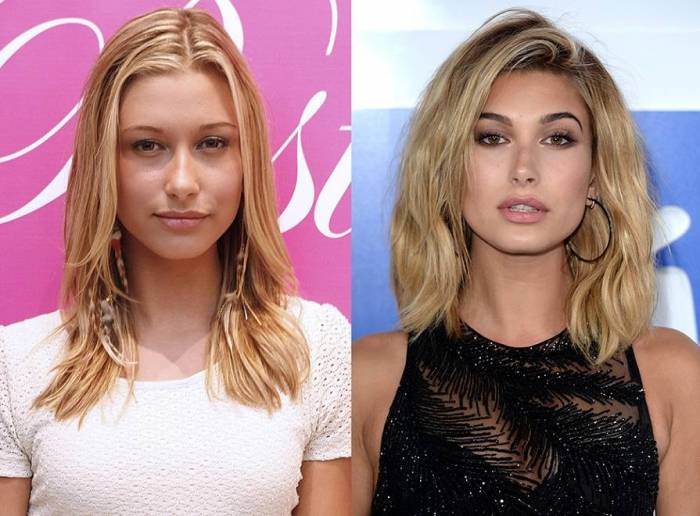 Хейтеры Хейли Болдуин склонны считать, что она также проводила удаление комков Биша. Но это не так – в этом случае обострение овала лица обусловлено как раз таки взрослением.