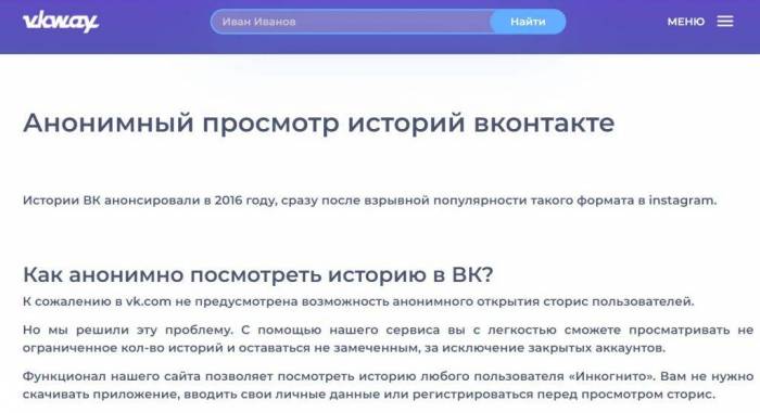Вместе с приложениями появляются сервисы, имеющие похожий функционал. С их помощью можно также смотреть истории в ВК анонимно онлайн без ведома другого человека. Но стоит быть осторожным, ведь в большинстве таких сайтов речь идет о краже личных данных. Если приводить популярные сервисы, здесь можно выделить vkway.ru/anon. По заявлению разработчиков, с помощью сайта удается посмотреть сторис анонимно, то есть без ведома ее создателя.