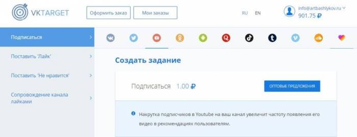 Vktarget — можно использовать для работы сайт или скачать приложение на телефон. Оплата за действия начисляется в рублях, при желании Вы даже можете вывести её на электронный кошелёк. Чтобы создать своё задание и привлечь подписчиков на Ютуб канал, Вам нужно щёлкнуть в правом верхнем углу на значок своего аккаунта и выбрать из списка «Оформить заказ». В появившемся окне сверху на ленте выбрать иконку Ютуба, указать название, ссылку, добавить число исполнении и бюджет. Стоимость одного подписчика оценивается в 1 руб.