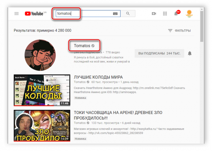 - Зайдите на YouTube, введите название канала и перейдите на него.