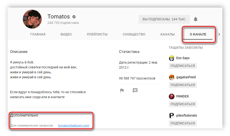 - Находясь на странице пользователя, перейдите во вкладку «О канале» и найдите в описании пометку «Дополнительно». Обычно здесь указывают адрес электронной почты для деловых предложений.