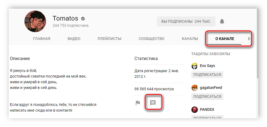 Один из вариантов написать человеку — изучить описание Ютуб-канала. Многие пользователи, которые профессионально занимаются заработком на YouTube, приводят подробную информацию в профиле (в том числе данные для связи). Найти такие сведения не составляет труда. Сделайте следующие шаги: