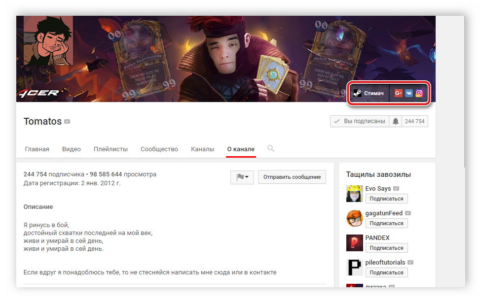 Если в этом разделе нет информации, попробуйте запустить один из роликов. Иногда необходимая информация приводится в описании к нему. После перехода по приведенной ссылке можно написать владельцу канала на Ютубе в ЛС уже в социальной сети. Это даже удобнее, чем писать в личку на YouTube.