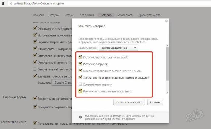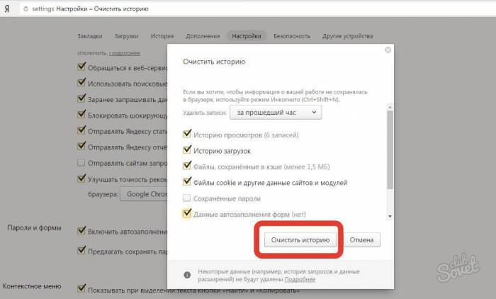 Удаление истории через настройки браузера