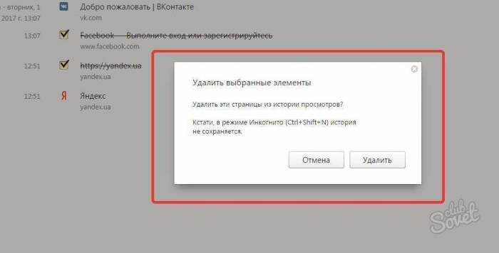 В результате этих действий указанные страницы с историей посещений будут удалены.