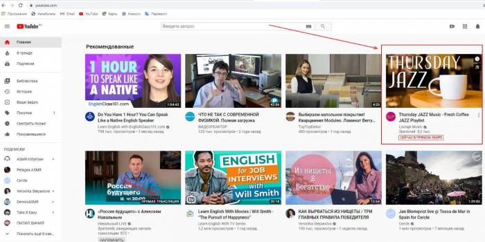 - Теперь вы на ютубе под своим профилем. Теперь вы можете найти в поисковике нужное видео или выбрать автоматически рекомендованные, согласно предыдущим просмотрам. Подпишитесь на автора, которого недавно смотрели, или найдите в строке поиска. Выберете одно из его видео, и нажмите на него: