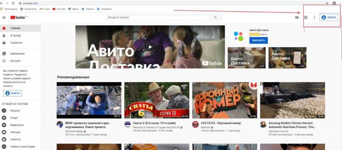 - Зайдите на хостинг https://www.youtube.com/ и кликните по кнопке «Войти» справа в самом верху:
