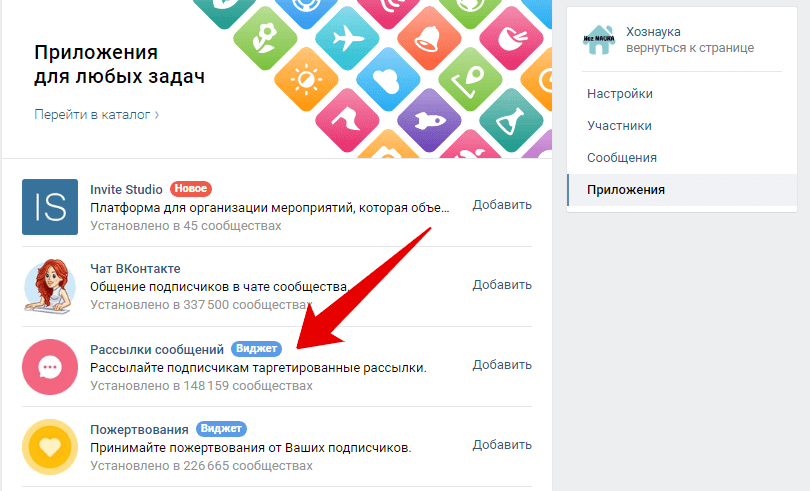 Из доступных приложений выбрать «Рассылки сообщений» и нажать «Добавить».