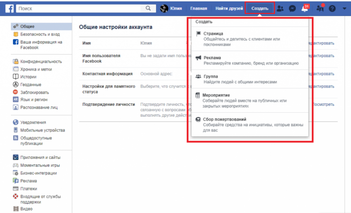 Создав учетную запись Facebook, человек может также создавать страницы для различных организаций, включая компании, группы или сообщества, рекламный аккаунт, магазины, продукты и виды развлечений. Каждая из этих страниц также требует бит информации для успешного создания страницы: