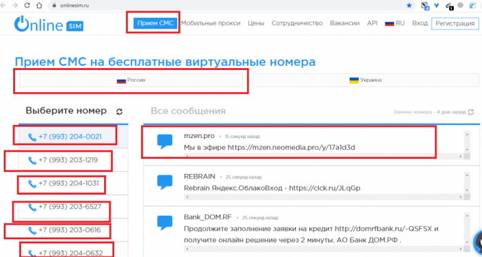 сервис “onlinesim.ru”. Сначала нужно выбрать страну, далее выбрать номер, после выбора, перед глазами откроется список смс, которые были присланы на выбранный номер для других пользователей, копируем номер: